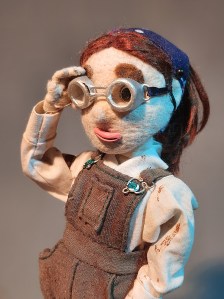 Marble wears a bandana to cover her hair and goggles to protect her eyes when welding.