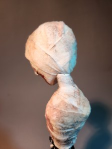 Red’s top half is completely covered with gauze and painted in red, brown, and black for depth.